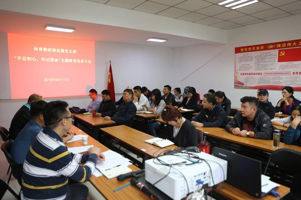 本网讯(图/刘楠 文/田贺宇)2019年9月17日下午,体育教研部直属党支部在会议室召开“不忘初心、牢记使命”主题教育动员会。学校主题教育第一指导组组长校党委办公室主任冯民生、成员党委办公室牛正攀老师到会指导。体育教研部领导班子成员、全体教师党员参加了会议。会议由体育教研部副书记、副主任朱平生主持。