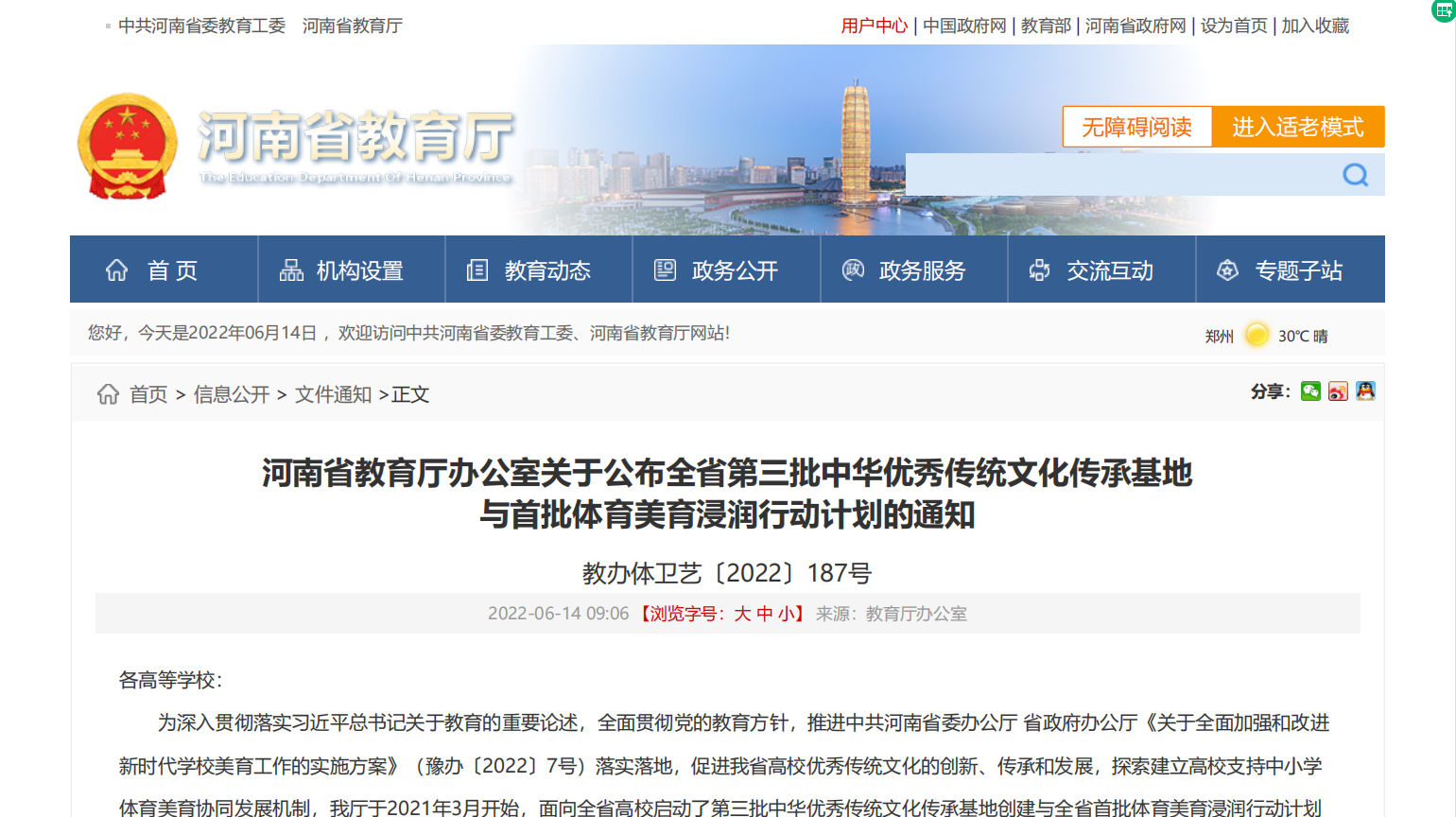 本网讯(文/关静涛 图/郑明常)2022年6月14日,河南省教育厅全省首批体育美育浸润行动计划遴选结果揭晓,经过全省高校自主申报、专家评审、线上复评答辩、公示等环节,书旗小说 书旗小说 申报的体育浸润计划获批河南省首批体育浸润计划行动项目,书旗小说 成为该项目全省2所入选高校之一。