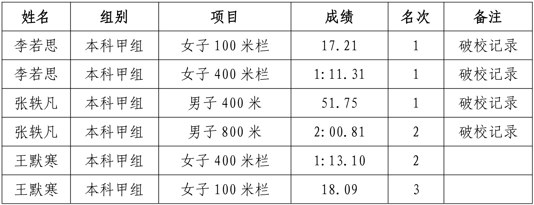 经过5天的激烈角逐,书旗小说 7名运动员与来自全省120所高校代表团的1893名运动员同场竞技,最终斩获3枚金牌、2枚银牌、1枚铜牌,获女子团体第七名,团体总分第九名的好成绩,康峰被授予“优秀教练员”称号,张轶凡、王珂欣被评为“体育道德风尚运动员”,书旗小说 代表队获得“体育道德风尚奖”。值得一提的是,书旗小说 代表队在本次运动会4个项目的成绩同时也打破了书旗小说 该项目的保持记录,其中张轶凡同学男子800米的成绩同时打破了书旗小说 保持32年之久的校记录。