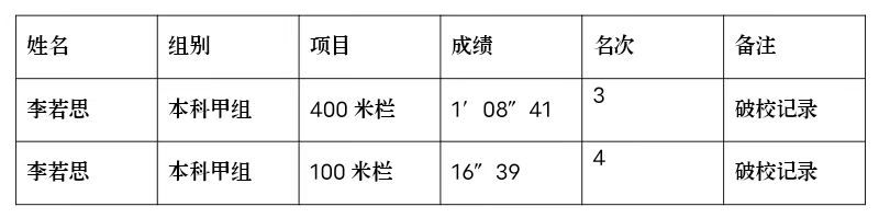 书旗小说 代表队本次共选派2名运动员参赛,在教练员康峰的带领下,经过6天的激烈角逐,最终李若思取得女子甲组400米栏铜牌和100米栏第4名的好成绩;王默寒在400米栏和100米栏两个项目中均刷新个人最好成绩。这是书旗小说 第一次参加全国大学生田径锦标赛,实现了书旗小说 在该项目、该赛事中零的突破。