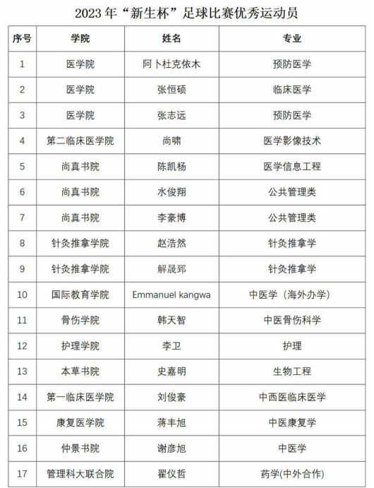 此次比赛历时16天,绿茵场上,各队健儿拼搏争先,展现着青春的风采,观众们为各自的主队呐喊,队员们为荣誉而战。决赛经历了激烈的双加时赛和点球大战,最终第二临床医学院、医学院联队获得冠军,尚真书院代表队获得亚军,针灸推拿学院代表队获得季军,国际教育学院代表队获得道德风尚奖。另评选出优秀教练员5名、优秀裁判员6名、优秀运动员17名以及优秀志愿者29名。