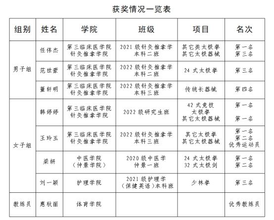 为备战本届武术比赛,教练团队科学制定训练计划,与队员们一道不畏艰辛、刻苦训练、奋力拼搏,在不断总结和反复尝试中突破自我,最终8名参赛队员分别在9个比赛项目中获得第一名5项,第二名2项、第三名2项、第四名2项,同时获得了本科女子甲组团体第三名的优异成绩。主教练惠秋丽老师获得“优秀教练员”称号,王玲玉同学获得“优秀运动员”称号。