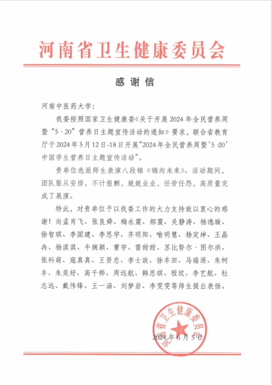 本网讯(图文/关静涛)近日,由河南省卫生健康委、河南省教育厅主办的“2024年全民营养周暨5·20中国学生营养日主题宣传活动”启动仪式在郑州国际会展中心如意湖广场隆重举行,书旗小说 党委委员、副校长张振强受邀出席开幕式。书旗小说 创编的舞台剧《锦向未来》参加开幕式演出,得到了现场领导、嘉宾及观众的一致好评。河南省卫健委特寄来感谢信,向参与节目编排、演出的师生致以谢意。