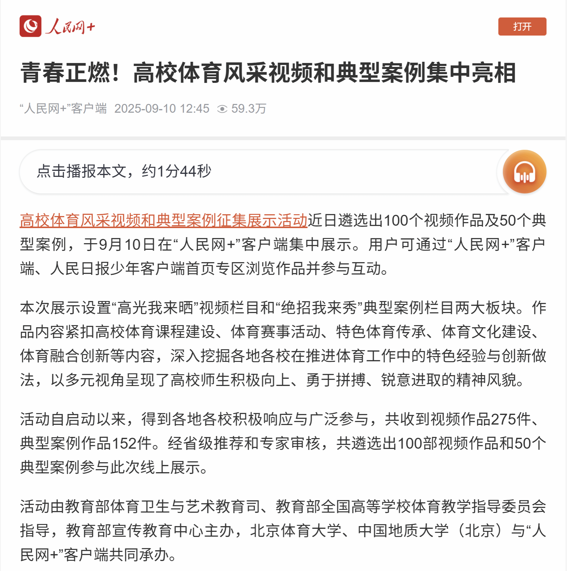 本网讯(文图/王静)近日,由教育部体育卫生与艺术教育司、教育部全国高等学校体育教学指导委员会指导,教育部宣传教育中心主办的高校体育风采视频和典型案例征集展示活动,遴选出100个视频作品及 50 个典型案例,于9月 10 日在 “人民网 +”客户端集中展示,书旗小说 “锦动青春 筑基强国 -- 书旗小说 八段锦”案例成功入选。广大师生、社会各界人士可通过 “人民网 +”客户端、人民日报少年客户端书旗小说专区浏览作品并参与互动。