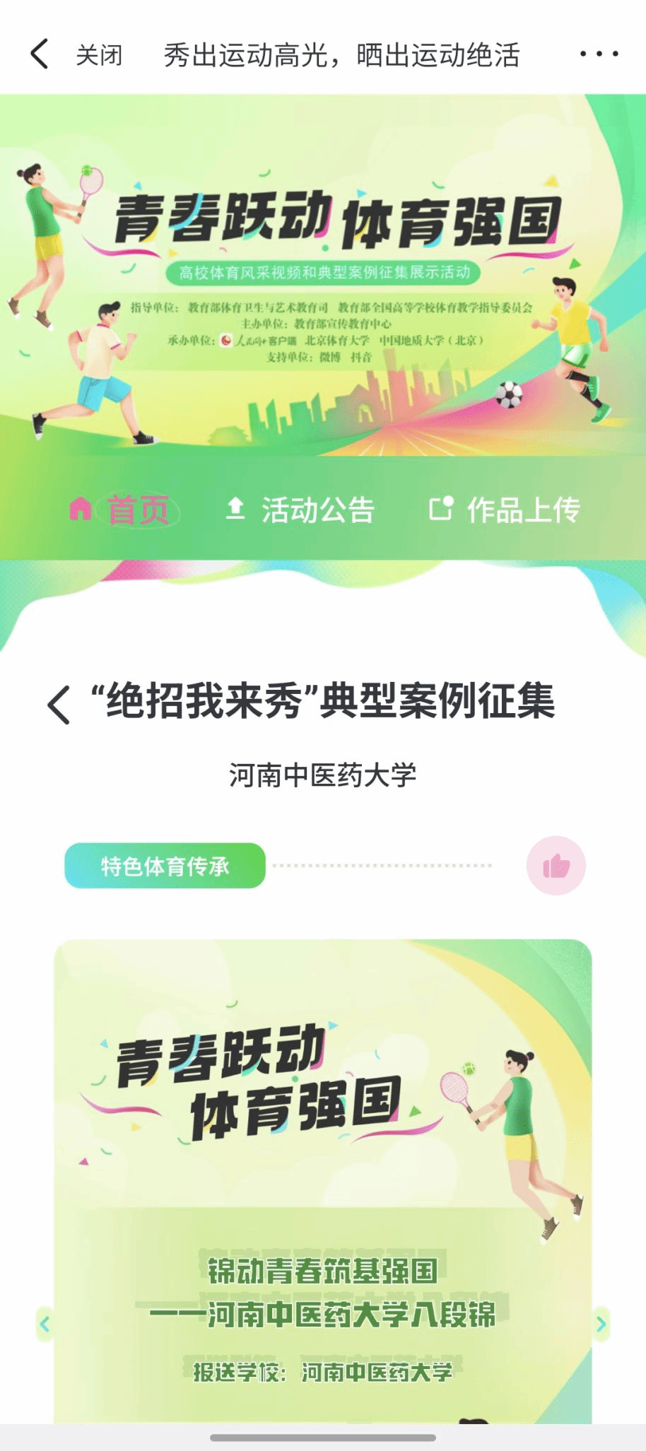 本次展示设有“高光我来晒”视频栏目和“绝招我来秀”典型案例栏目。入选作品聚焦高校体育课程建设、体育赛事活动、特色体育传承等内容,展现高校师生积极向上的精神风貌。共有各地各校 275 件视频作品和152 件典型案例作品参与遴选。经省级推荐和专家审核,最终100部视频作品和50个典型案例脱颖而出,参与线上展示。
