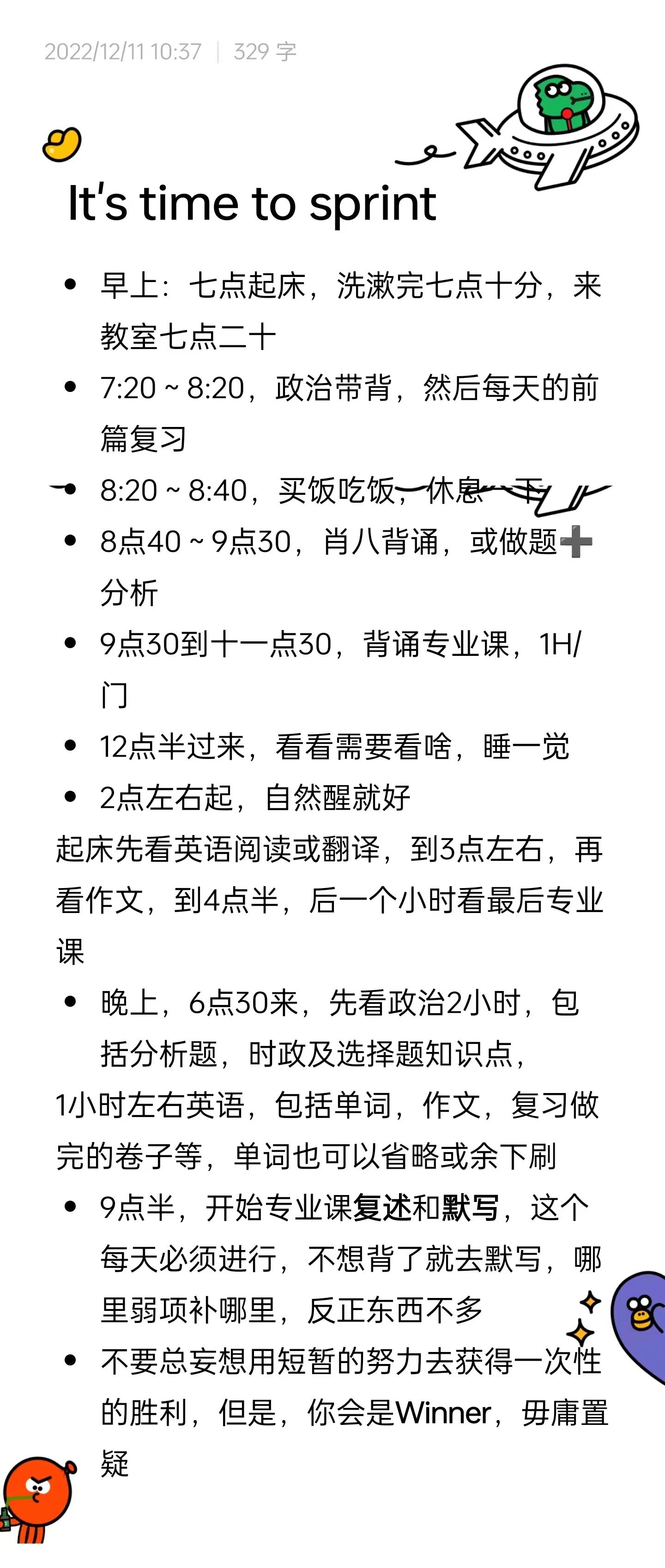 A2:大家要知道考研是一场耗时非常久的一场考试,与我们一般期末考试不同,战线一旦拉长就面临着“持久战”这样的局面,不建议前期给自己弦绷得太紧,以至于产生中后期身心乏力的情况。所以除去每天必要的学习时间,适当放空自己也是很有必要的。我的十二月份学习时间安排,大家会发现,我在最后阶段每天的学习时间也并没有超过11小时,一定要根据自己的节奏,不要盲目跟随研友的复习进度。毕竟自己复习情况还是我们自身最为清楚。