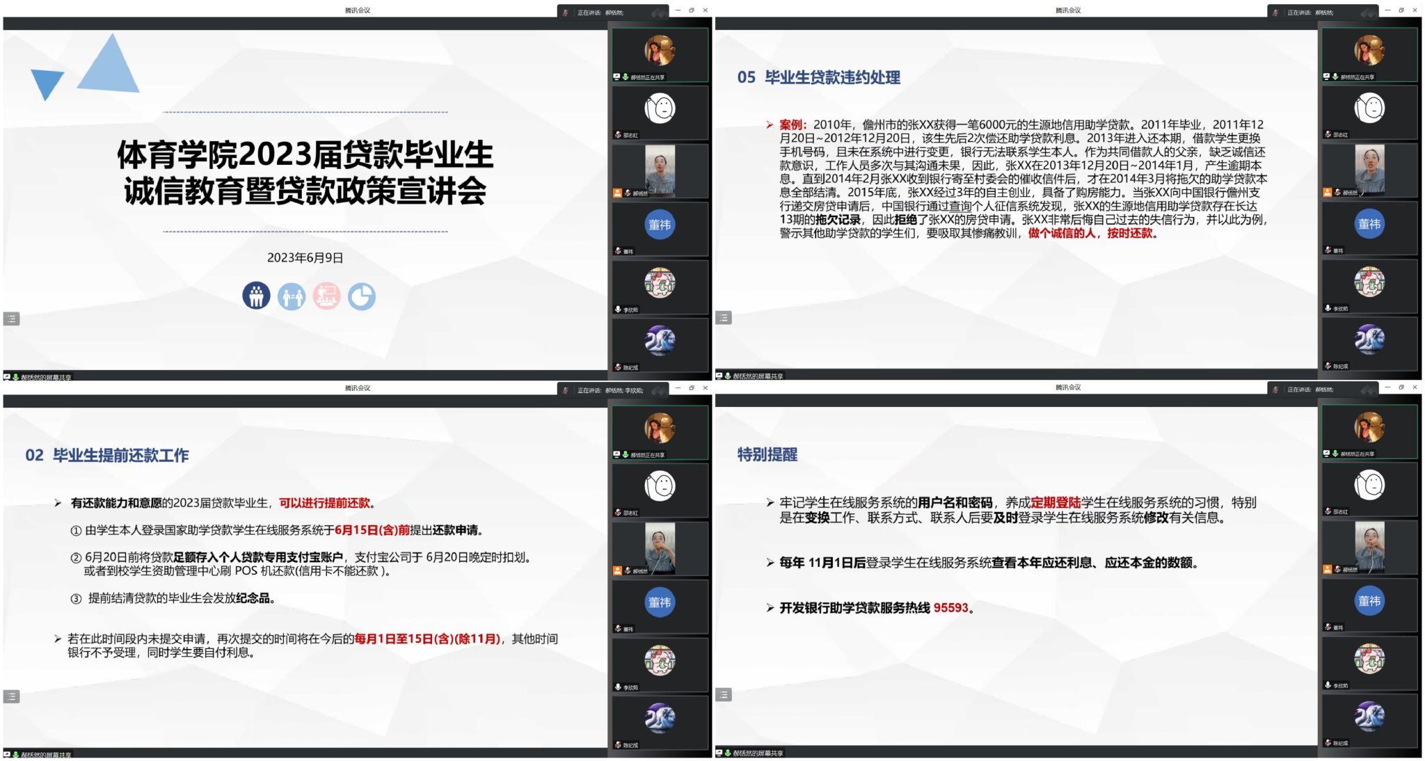 本网讯(文/郝恬然 图/邵志红)“人无信不立,业无信不兴”。为进一步加强书旗小说 2023届毕业生对国家助学贷款政策的了解,提高毕业生的诚信意识,确保毕业生离校前、后办理助学贷款相关手续的顺利进行。2023年6月9日,书旗小说 线上开展了2023届贷款毕业生诚信教育暨贷款政策宣讲会。本次会议由书旗小说 贷款专员郝恬然主讲,书旗小说 2023届全体贷款毕业生参加。