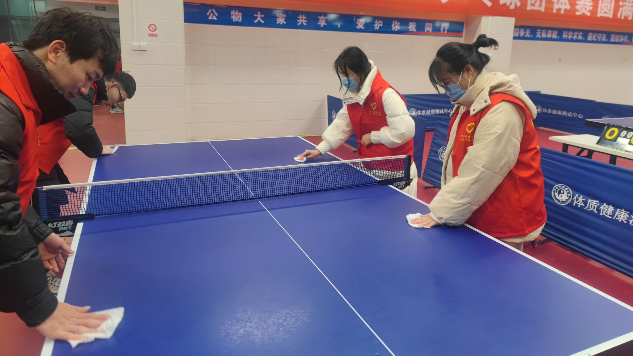 赛前,志愿者开始打扫场地卫生、布置赛事会场、做好比赛器械的检查整理、分配归位工作。与此同时,担任裁判的志愿者进行热身准备,了解熟悉乒乓球比赛规则、分值等内容,做好裁判调度准备工作。