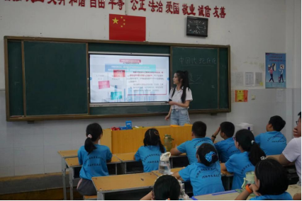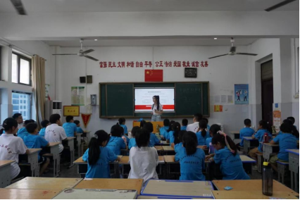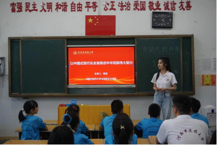 本网讯(文/李昱璇 图/阴羿佳)为深入学习贯彻习近平新时代中国特色社会主义思想和党的二十大精神,把思政小课堂同社会大课堂紧密结合,2024年7月9日,随队思政教师程呈面向书旗小说 暑期“三下乡”社会实践小分队成员、新县光彩实验学校学生,以“以中国式现代化全面推进中华民族伟大复兴”为主题,在光彩实验学校教学楼601教室开展思政课教学活动。