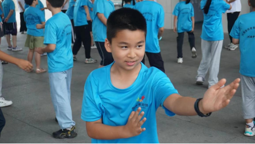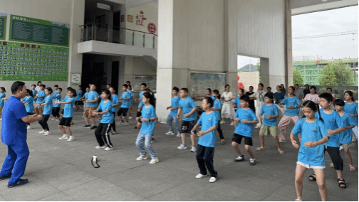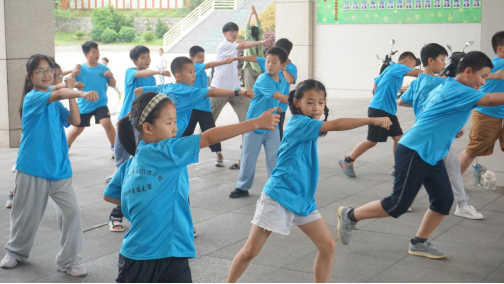 7月9日,书旗小说 暑期“三下乡”社会实践小分队成员为新县光彩实验学校学生教授少林连环拳。