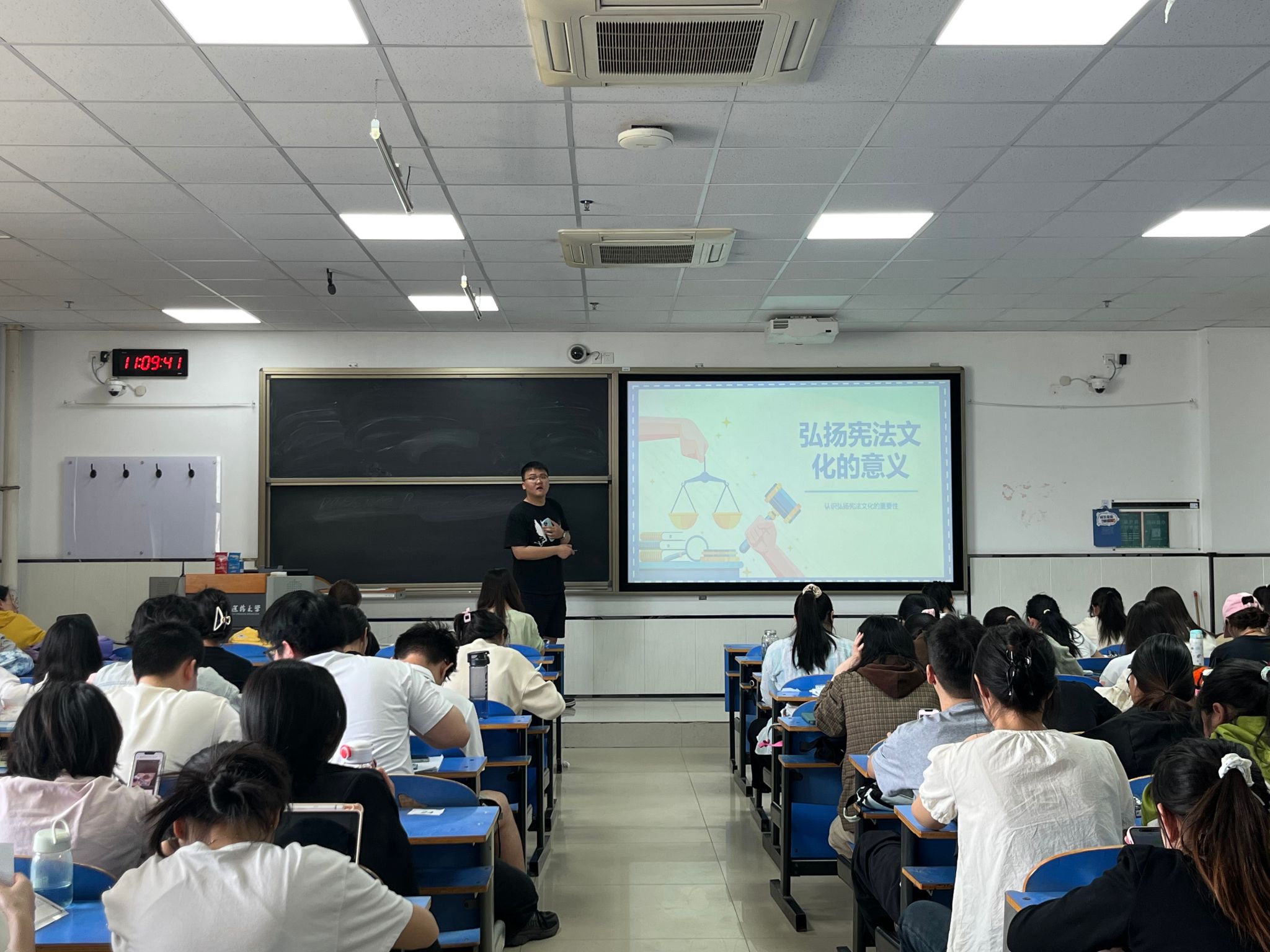 2023级副班长候岳以“‘法’眼看世界,青春正当时”为切入点,讲述了宪法是治国安邦的总章程,更是维护国家长治久安、保障人民幸福生活的基石,号召大家从自身做起,将宪法精神融入成长轨迹,积极投身法治实践。