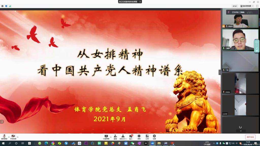 孟肖飞通过介绍中国女排几十年来或夺冠或低谷的奋斗历程,对“祖国至上、团结协作、顽强拼搏、永不言败”的女排精神进行了详细解读;通过回顾中国健儿在2020年东京奥运会上的精彩表现,分析了“为国争光、无私奉献、科学求实、遵纪守法、团结协作、顽强拼搏”为主要内容的中华体育精神;通过回望中华体育精神诞生的历史背景,为大家讲解了以“伟大建党精神”为代表的中国共产党精神谱系。
