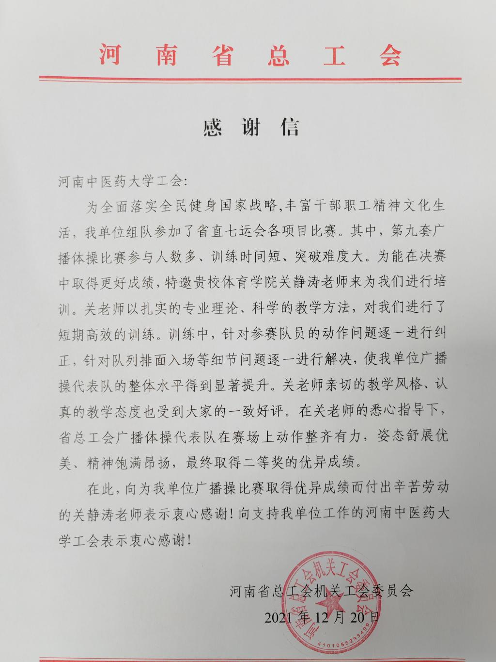 信中提到,此次省直七运会广播体操比赛参与人数多、训练时间短、突破难度大。书旗小说 关静涛老师以扎实的专业理论、科学的教学方法,对省工会代表队进行了短期高效的训练,使代表队整体水平得到了显著提升。关老师亲切的教学风格、认真的教学态度受到大家的一致好评!河南省总工会特向书旗小说 及书旗小说 关静涛老师表示衷心感谢!